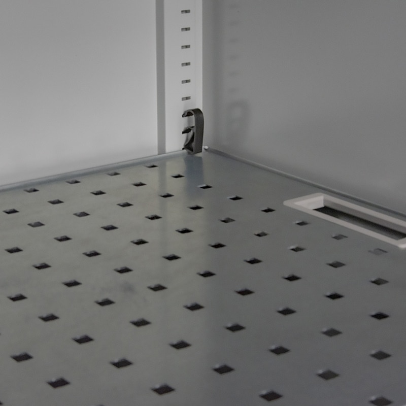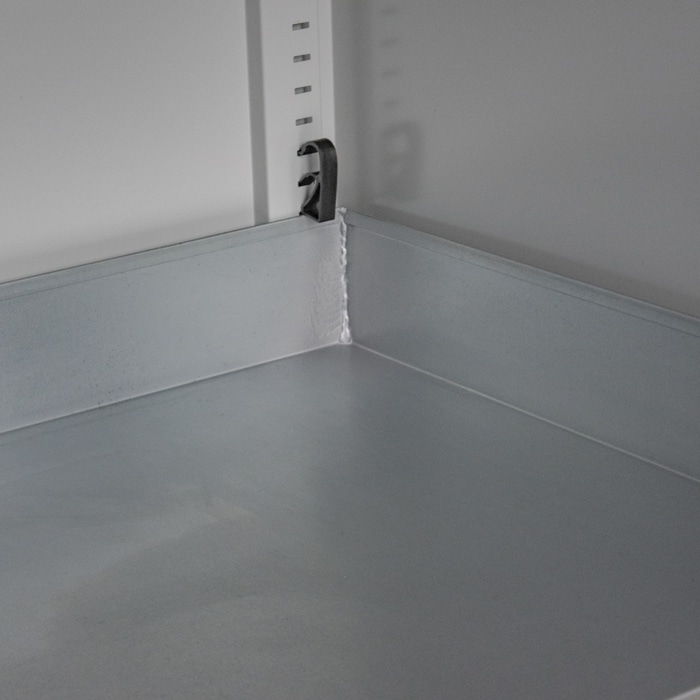 - Étagères/bacs de rétention d’une hauteur de 50 mm, réglables en hauteur sur crémaillères, au pas de 15 mm