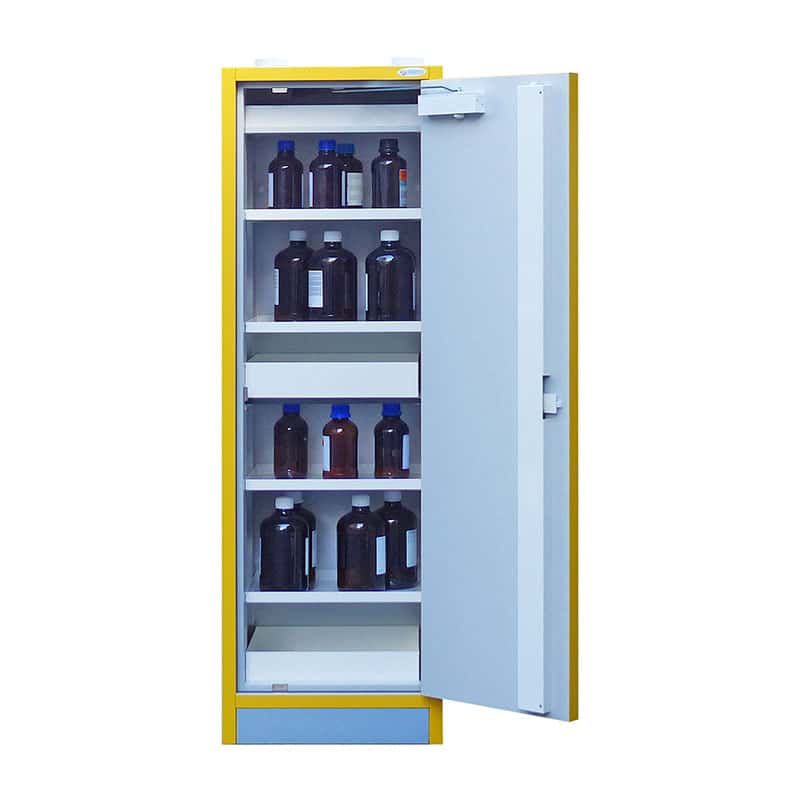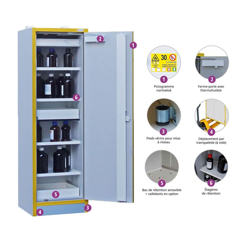 Conçue spécifiquement pour le rangement sécurisé de substances dangereuses. Dotée d’une capacité de 110 litres, cette armoire de conception française constitue une solution optimale pour les professionnels qui gèrent des produits toxiques, inflammables, ou d’autres composés chimiques risqués.