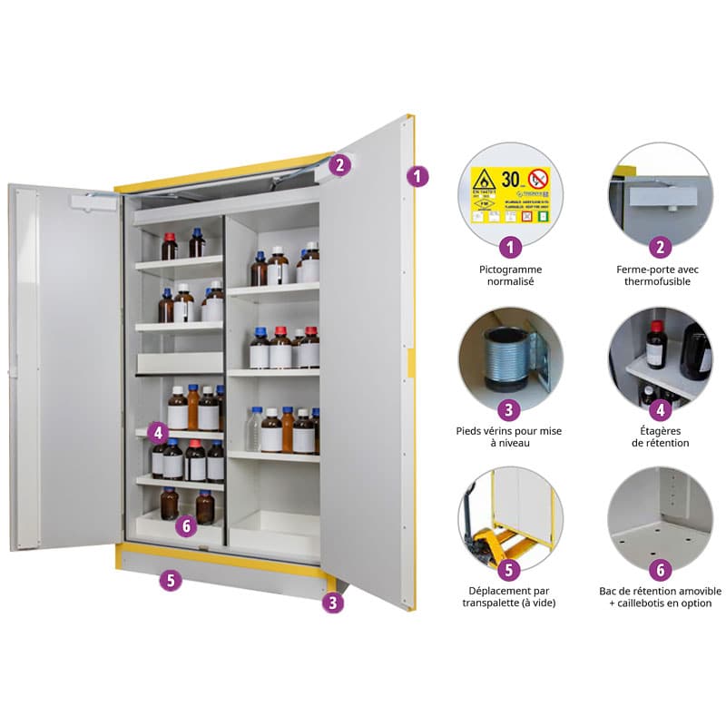 Découvrez notre armoire multirisques, spécialement conçue pour répondre aux besoins des professionnels confrontés à la gestion de produits dangereux. Dotée d’une capacité de 230 litres, cette armoire de fabrication française est l’outil idéal pour stocker de manière sécurisée des substances toxiques, inflammables ou tout autre produit chimique à risque.