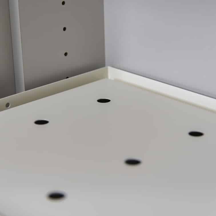 - Bac de rétention amovible en partie basse. Le bac de rétention doit être positionné en bas de votre armoire. Dans la mesure où vous souhaiteriez l’utiliser comme espace de stockage, vous devez impérativement y placer, au préalable, un caillebotis (inclus) correspondant à votre bac de rétention.