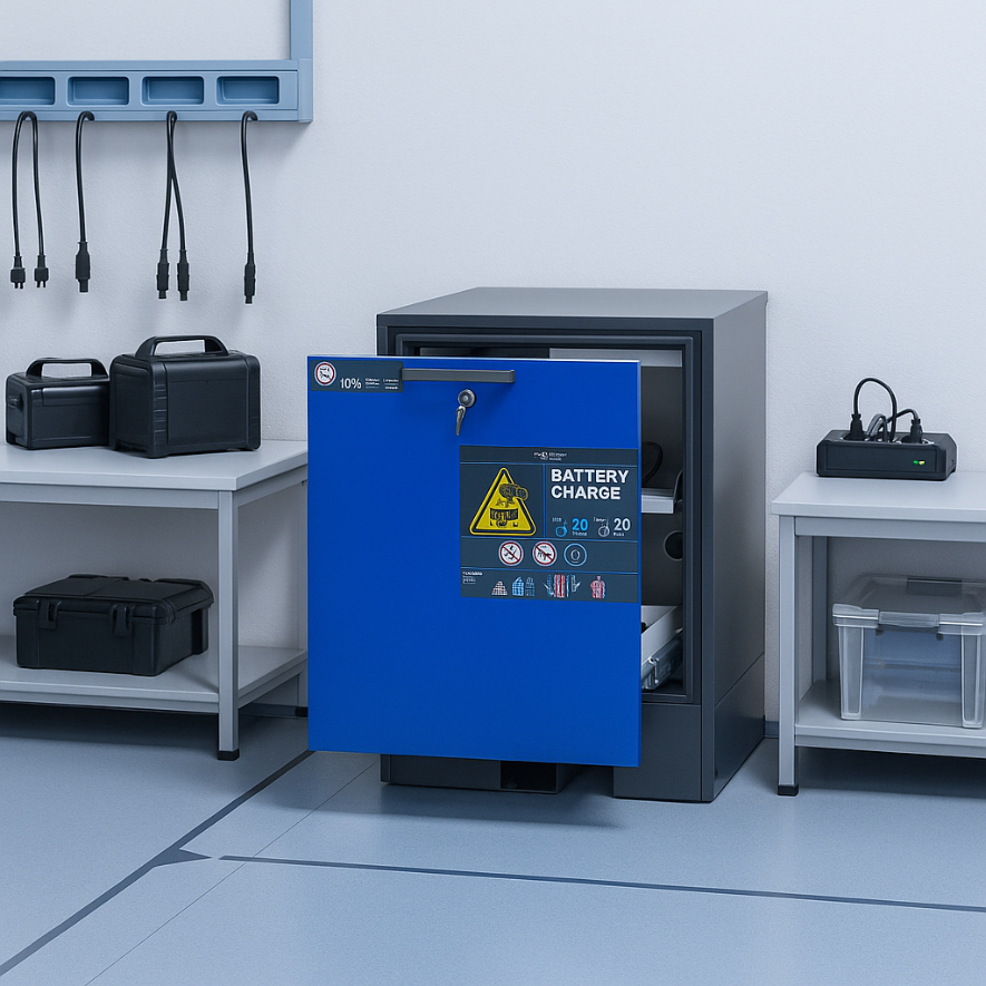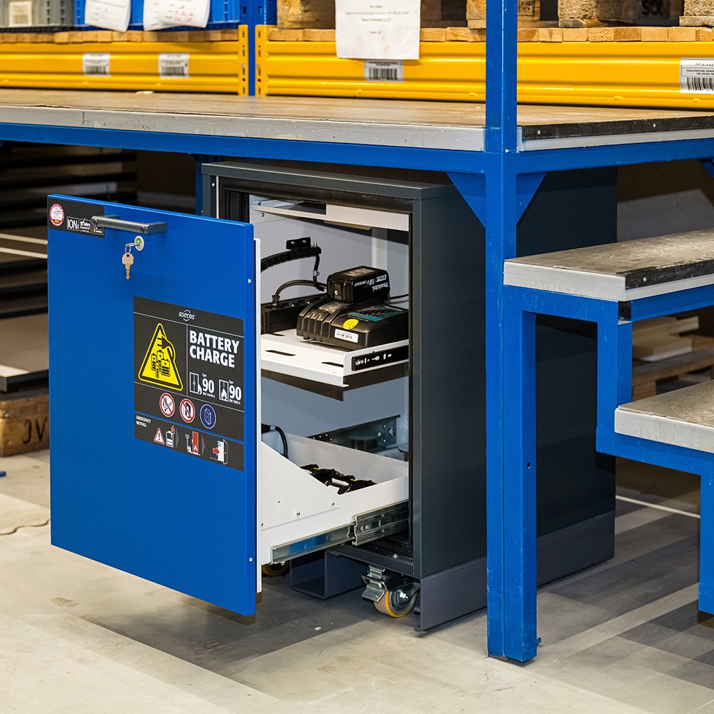 L’armoire ION-CHARGE-90 est conçue pour répondre aux besoins des professionnels qui recherchent une sécurité optimale pour le stockage et la charge active des batteries lithium-ion. Compacte et facile à intégrer dans divers espaces de travail, elle offre une combinaison parfaite de praticité, de sécurité, et de conformité.