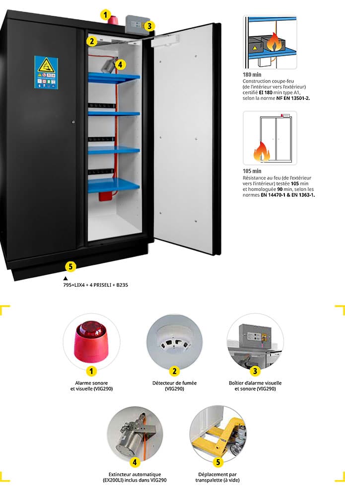 Attention : En cas d’incendie de batterie lithium dans une armoire, ne l’ouvrez pas et ne la déplacez sous aucun prétexte. L’intervention des pompiers est indispensable pour votre sécurité. Restez à distance et attendez leur arrivée