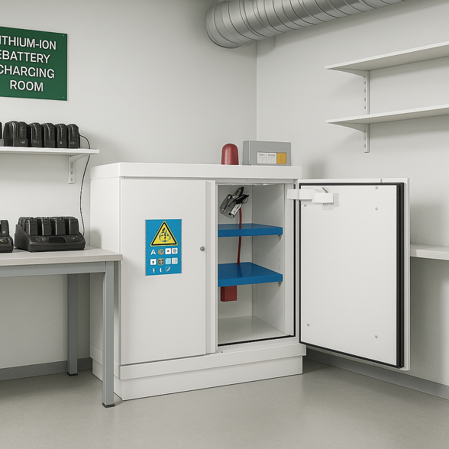 Armoire de sécurité pour le stockage de BATTERIE LITHIUM 90 MIN équipement complet – avec extincteur – Trionyx