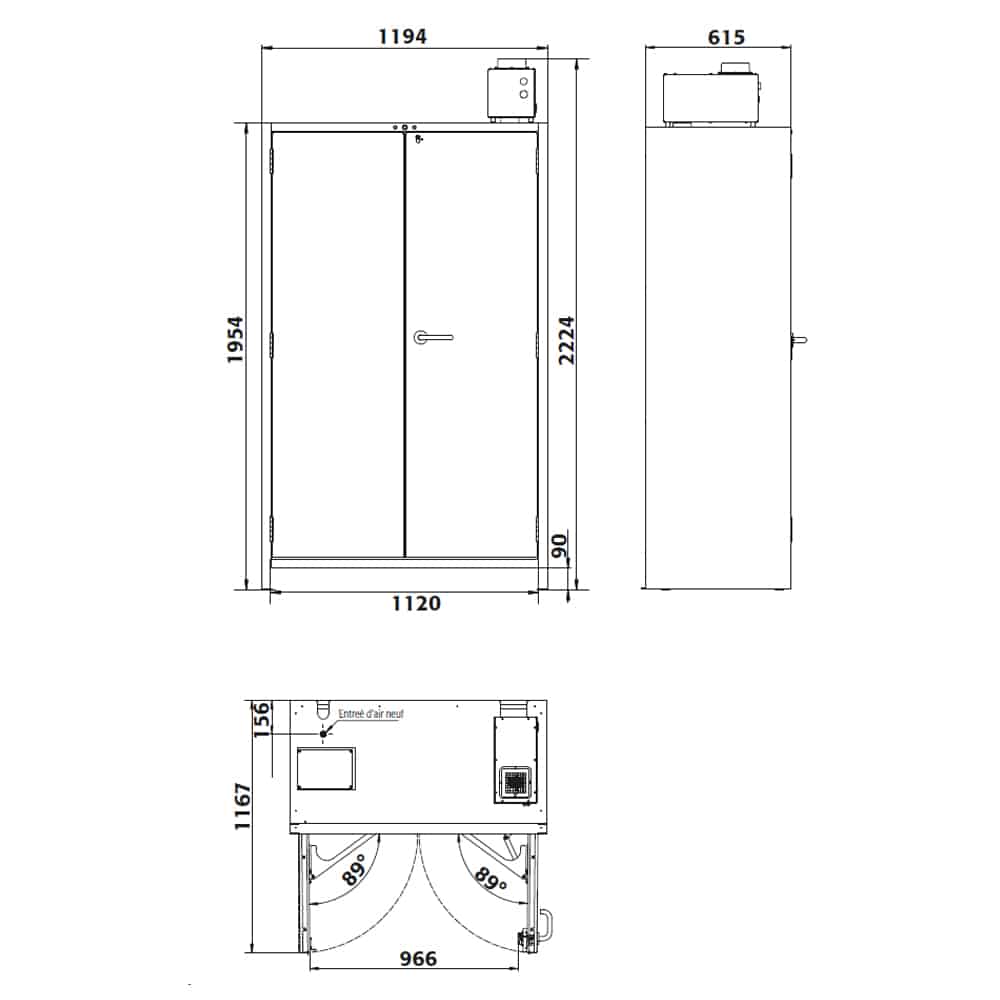 - Dimensions externes : L.1193 x P.615 x H.2224 mm.