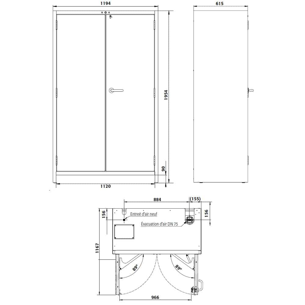 - Dimensions externes : L.1193 x P.615 x H.1953 mm.
