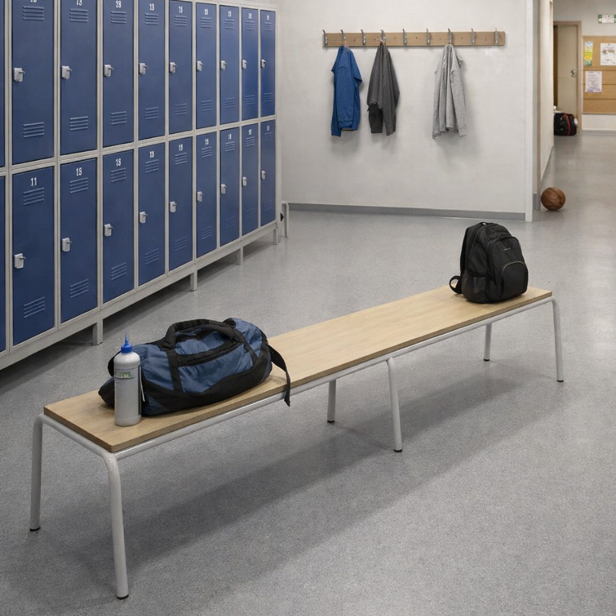 BANC INDEPENDANT (déjà monté) – banc central empilable (piétement tube) – diamètre 25mm en gris clair ral 7035 – construction stable – plateau en mélaminé hêtre miel ép.19mm – taille adulte (T6)
