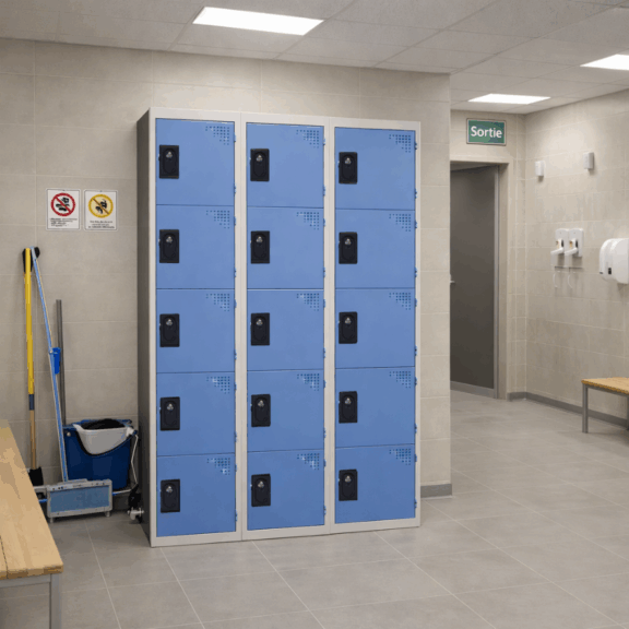 Optez pour le vestiaire multicases Gamme ACCESS, offrant 5 cases superposées par colonne afin de maximiser l’espace de rangement. Disponible en deux largeurs (L.30 ou L.40 cm) et en configurations de 1 à 3 colonnes (P.50 x H.180 cm), il s’adapte à une grande variété de secteurs : entreprises, collectivités, salles de sport, ateliers, etc.