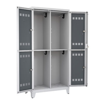 Les 2 vantaux centraux permettent d’accéder simultanément aux 4 casiers (2 colonnes × 2 niveaux). Configuration optimale pour petites équipes spécialisées nécessitant grands volumes de rangement.