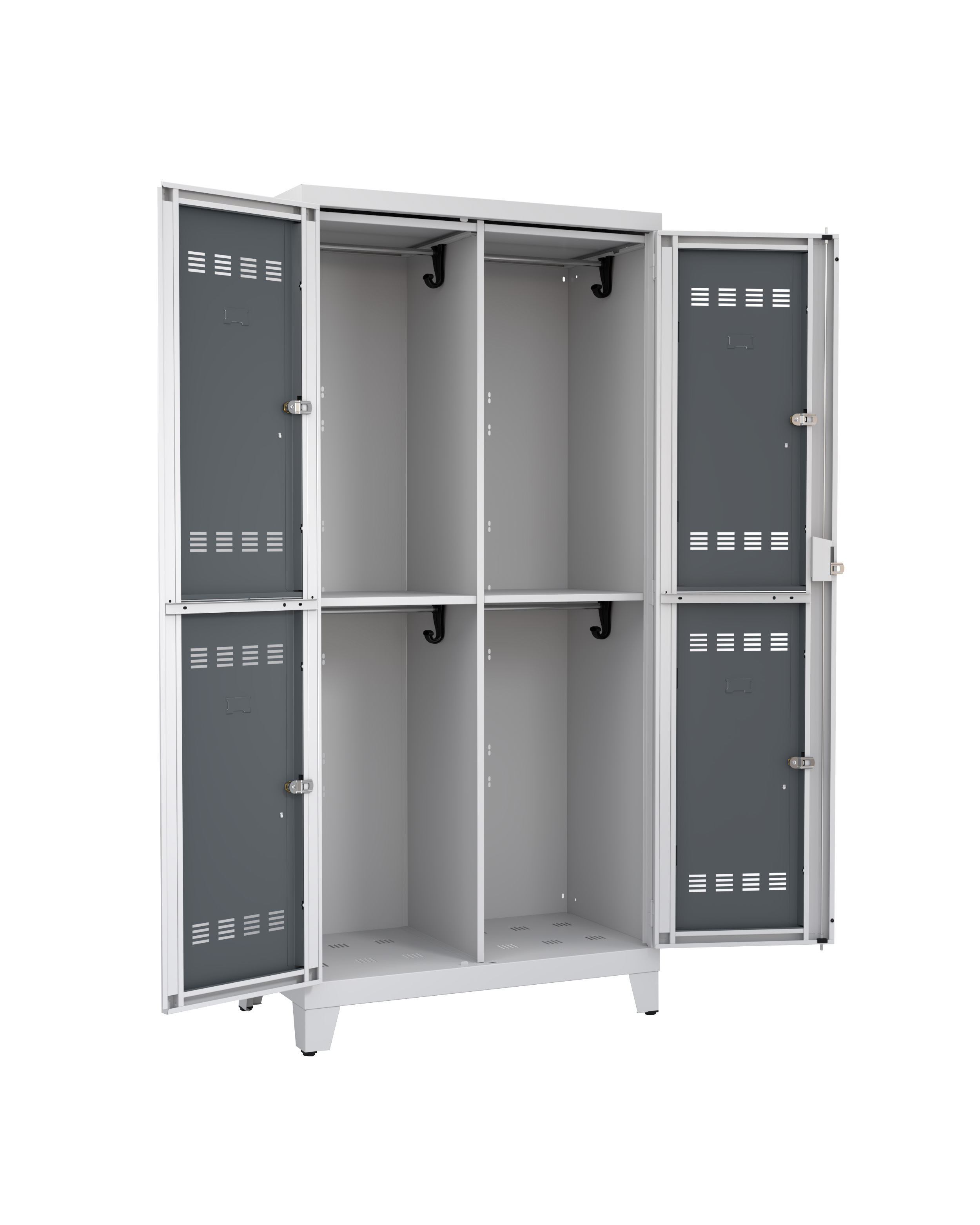 Ouverture : portes indégondables s’ouvrant à 180° pour accès optimal. Aérations : chaque porte est équipée d’aérations intégrées pour ventilation permanente et évacuation humidité. Sécurité : chaque casier dispose d’une fermeture 1 point avec came acier zinguée 2,5mm. Les 2 vantaux centraux ont une fermeture 3 points renforcée.