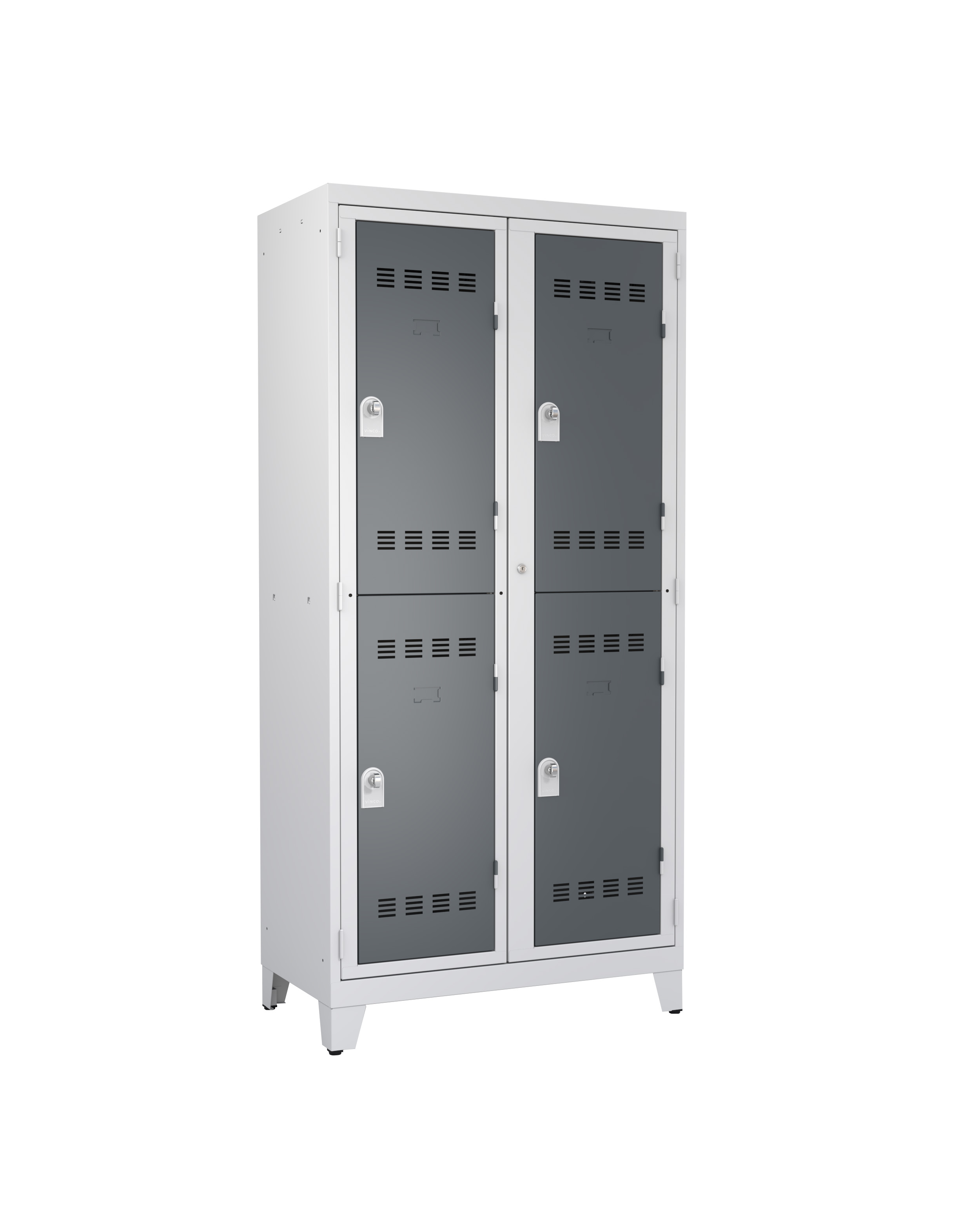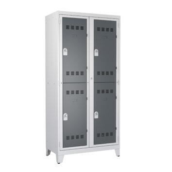 Avec seulement 2 casiers superposés, chaque case mesure 990 mm de haut. C’est le format XXL : idéal pour suspendre manteaux longs, combinaisons intégrales, tenues spéciales ou EPI encombrants (nucléaire, chimie). Équipe 4 personnes sur 0,95 m² au sol.