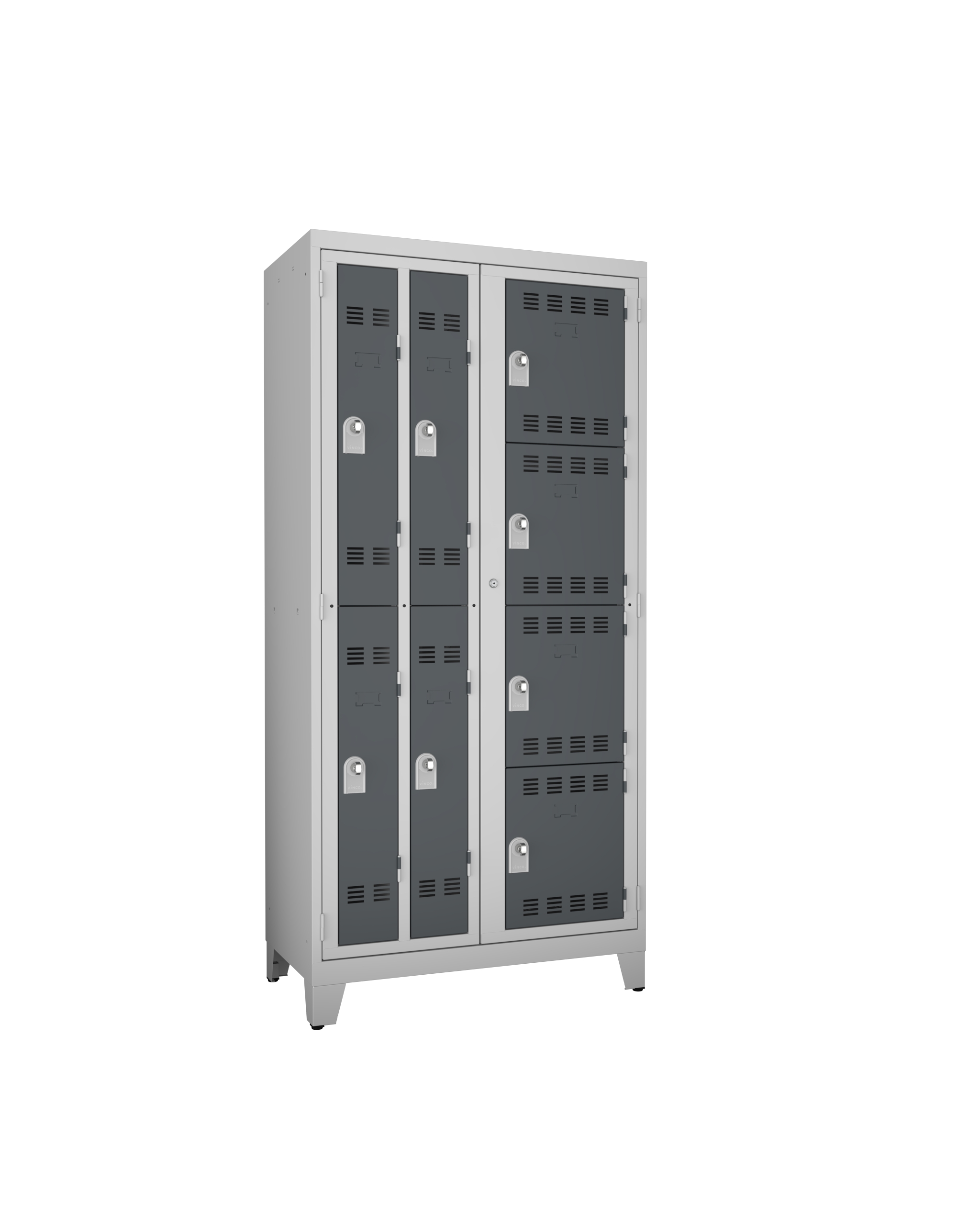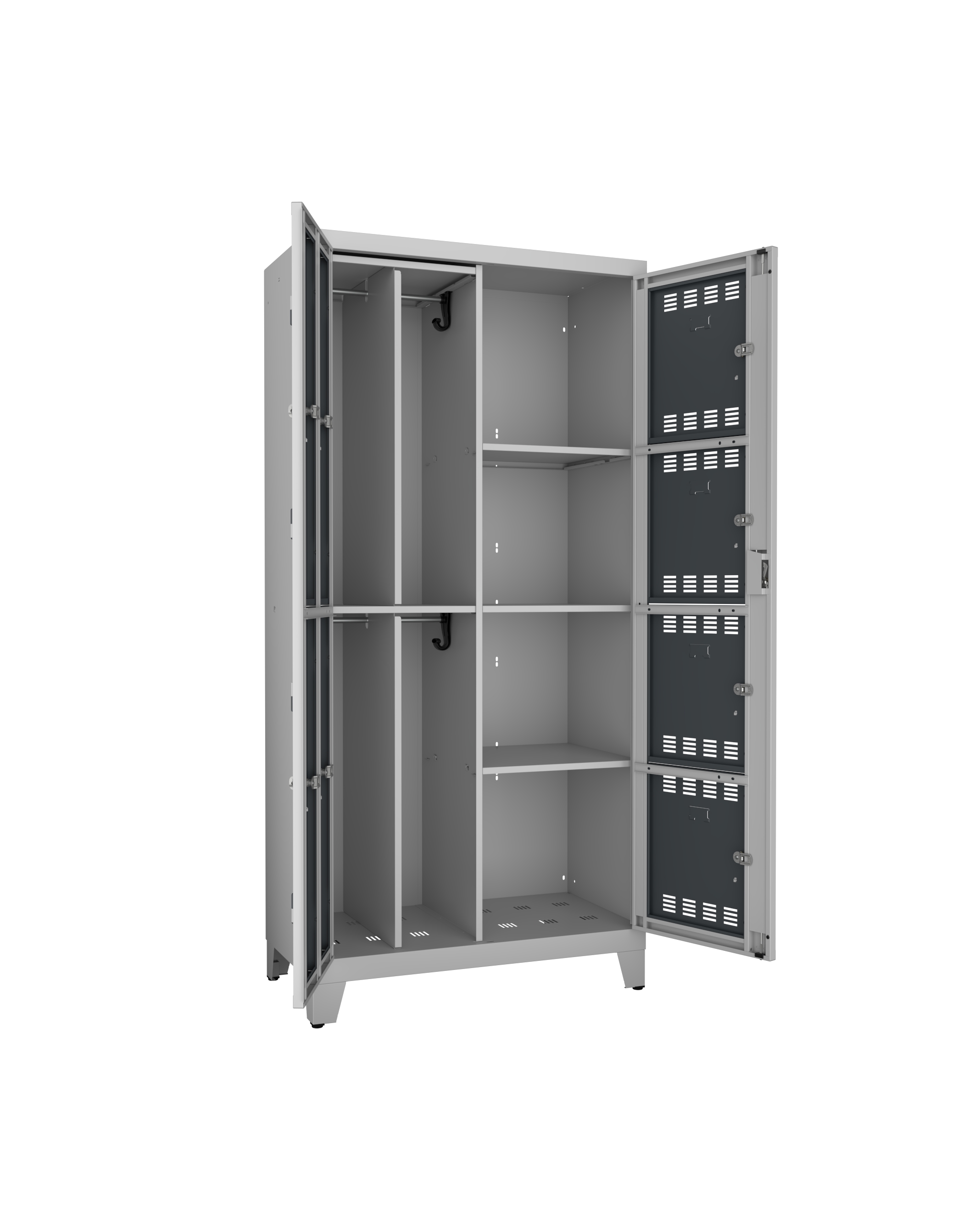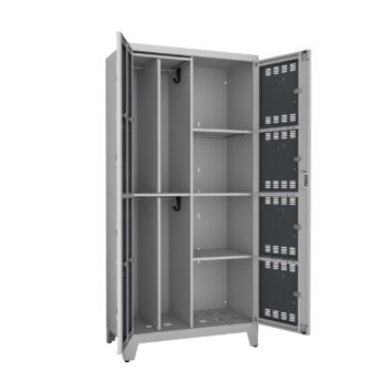 Ouverture : portes indégondables s’ouvrant à 180° pour accès optimal. Aérations : chaque porte est équipée d’aérations intégrées pour ventilation permanente et évacuation humidité. Sécurité : chaque casier dispose d’une fermeture 1 point avec came acier zinguée 2,5mm. Les 2 vantaux centraux ont une fermeture 3 points renforcée.