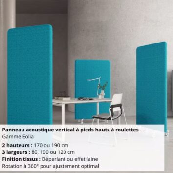 Panneau acoustique pieds hauts à roulettes – Tissus déperlant/effet laine – L.80/100/120 cm – Gamme Eolia